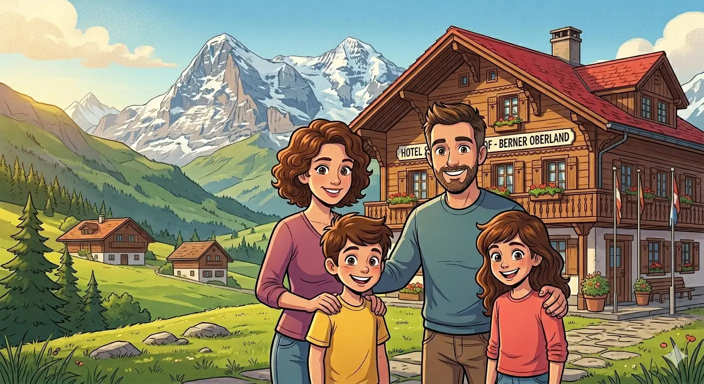 Als sie endlich im Bergdorf ankamen, war die Aussicht wunderschön. Grüne Hügel erstreckten sich, so weit das Auge reichte, und ein kleiner Fluss floss durch den Ort. Die Familie bezog ihr Hotel, ein traditionelles Holzgebäude mit einem roten Dach.
