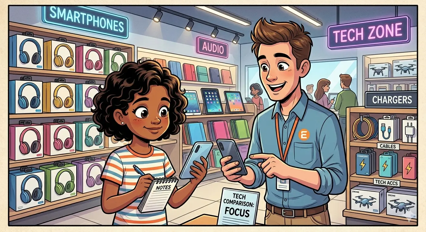 Der Verkäufer zeigt ihm drei verschiedene Modelle. Eines ist günstig, hat aber einen kleinen Bildschirm. Ein anderes ist teuer, aber sehr leistungsstark. Das dritte liegt dazwischen.
