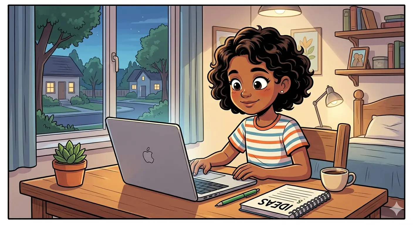 Diana se așază la birou și apasă butonul de pornire al computerului. Ecranul se aprinde și îi cere parola. Ea o tastează și așteaptă să apară desktopul.